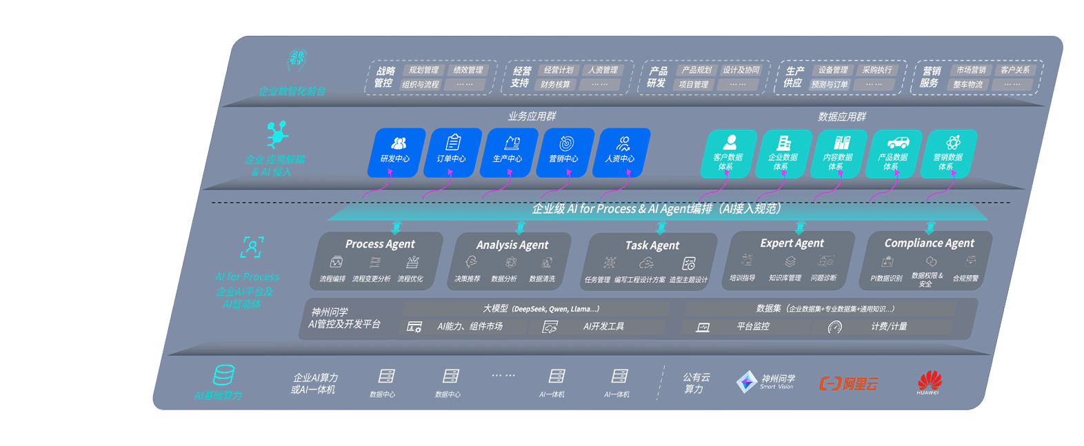 端到端的一站式AI工作空间深度融合了从企业战略规划到日常经营的全流程业务板块,,,,定向解决车企内部领域多、、部门多、、、链条长、、、场景碎片化等难题,,支持车企快速构建以AI为核心的生产力写作体系,,,实现任务执行与AI能力的无缝集成与交互