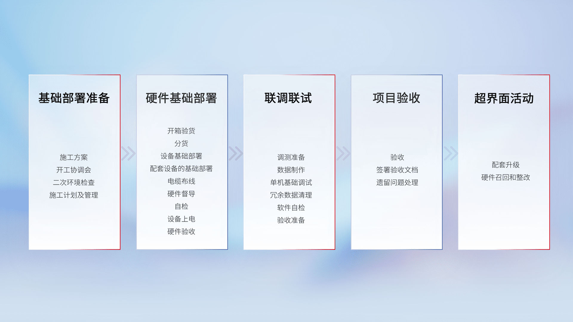 从基础部署准备、、硬件基础部署、、、联调联试、、、项目验收、、、、越界面活动的全过程可追溯,,保证施工质量和进度。。。。